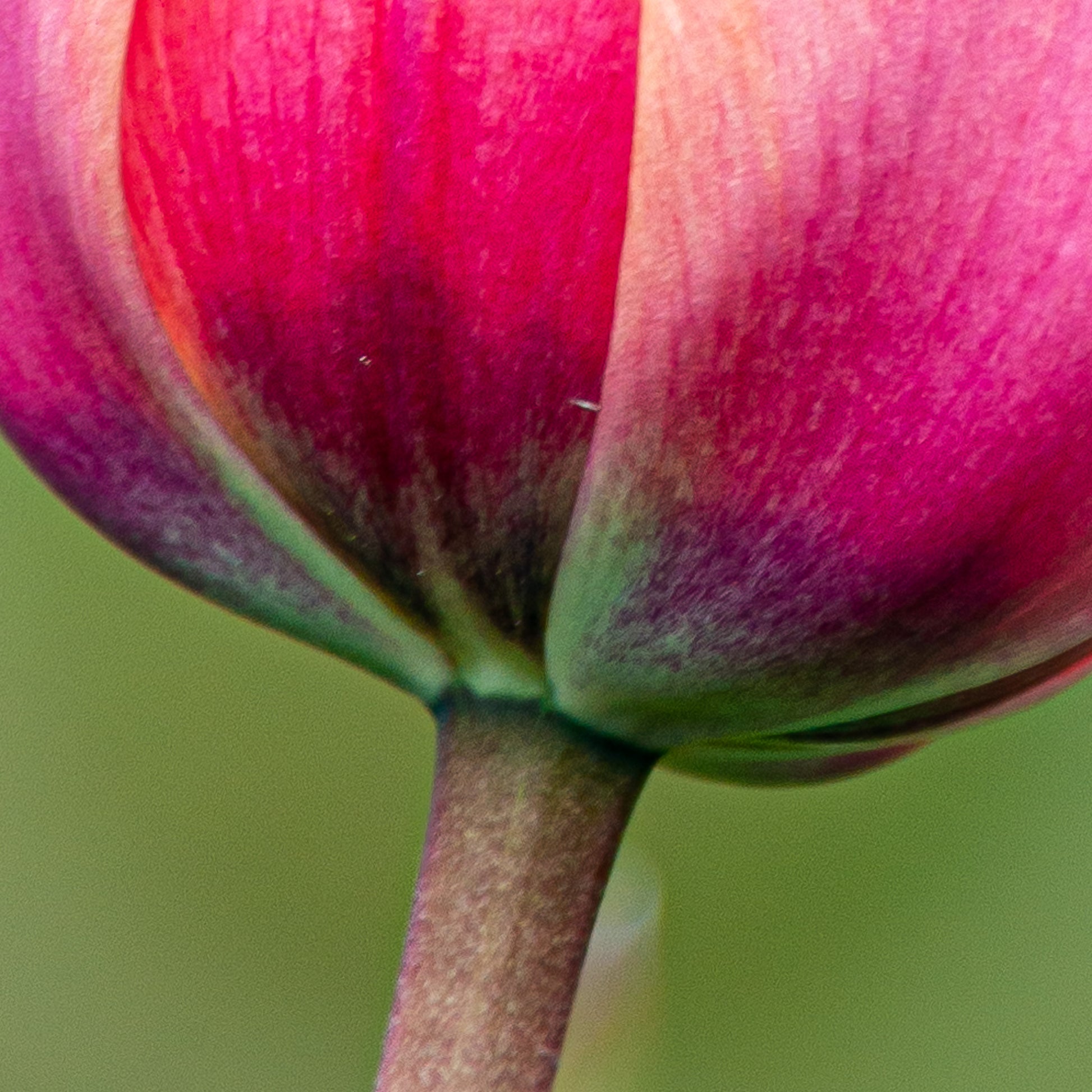 When considering the whole we should consider each and every detail as well. Sometimes these details are much more interesting. This tulip albeit extremely beautiful in its entirety is rather stunning when presented in this way. We see the smooth textured petals and their variegated lipstick pink colors and the long mottled stem. Details. Don't forget to notice the details. Old Mission Flowers, Traverse City, Michigan.