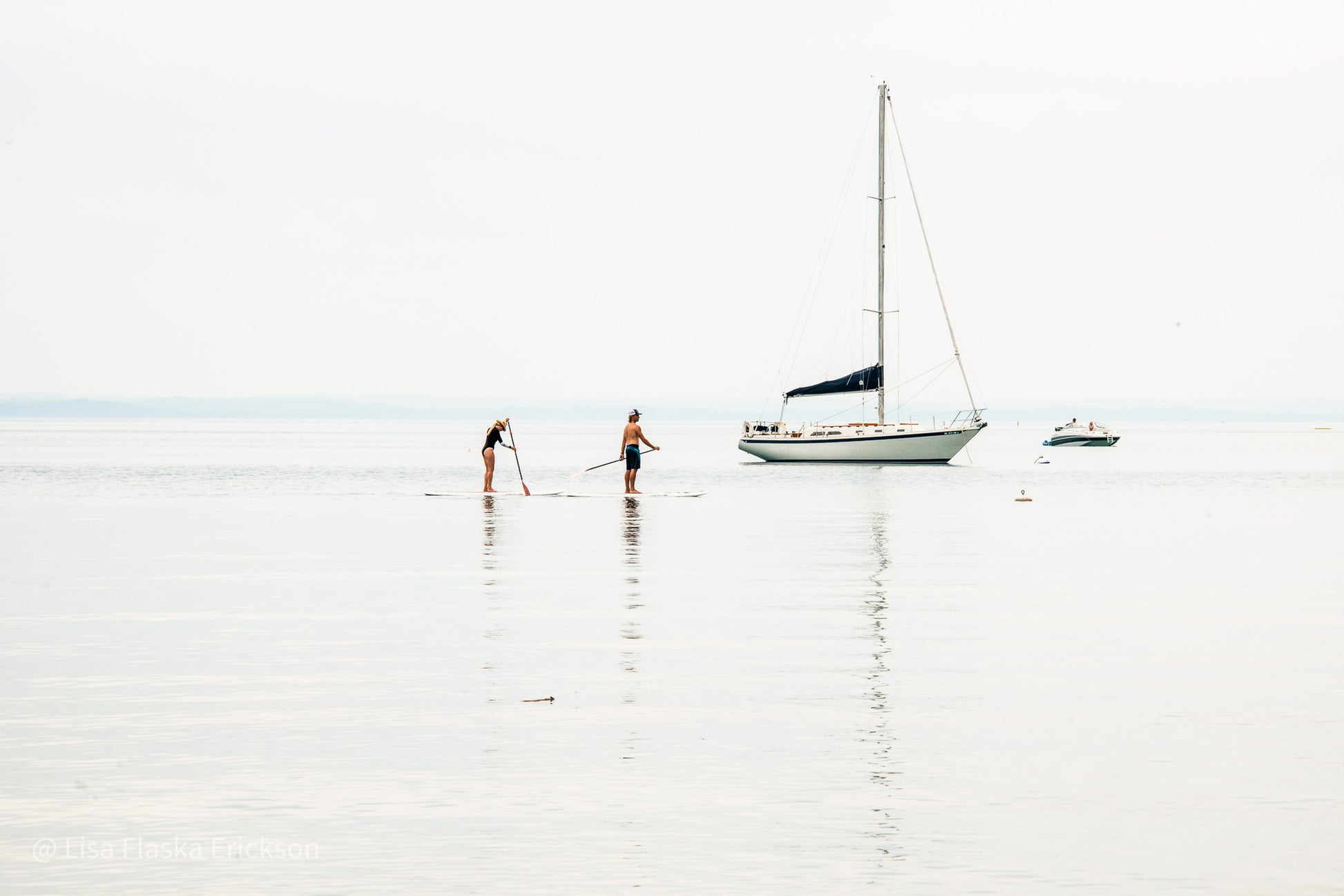 A lazy morning paddle across East Grand Traverse Bay. Nothing buy peace and quiet, that's for sure, and a tiny ripple from the paddle perhaps. Serenity now. Old Mission, Michigan