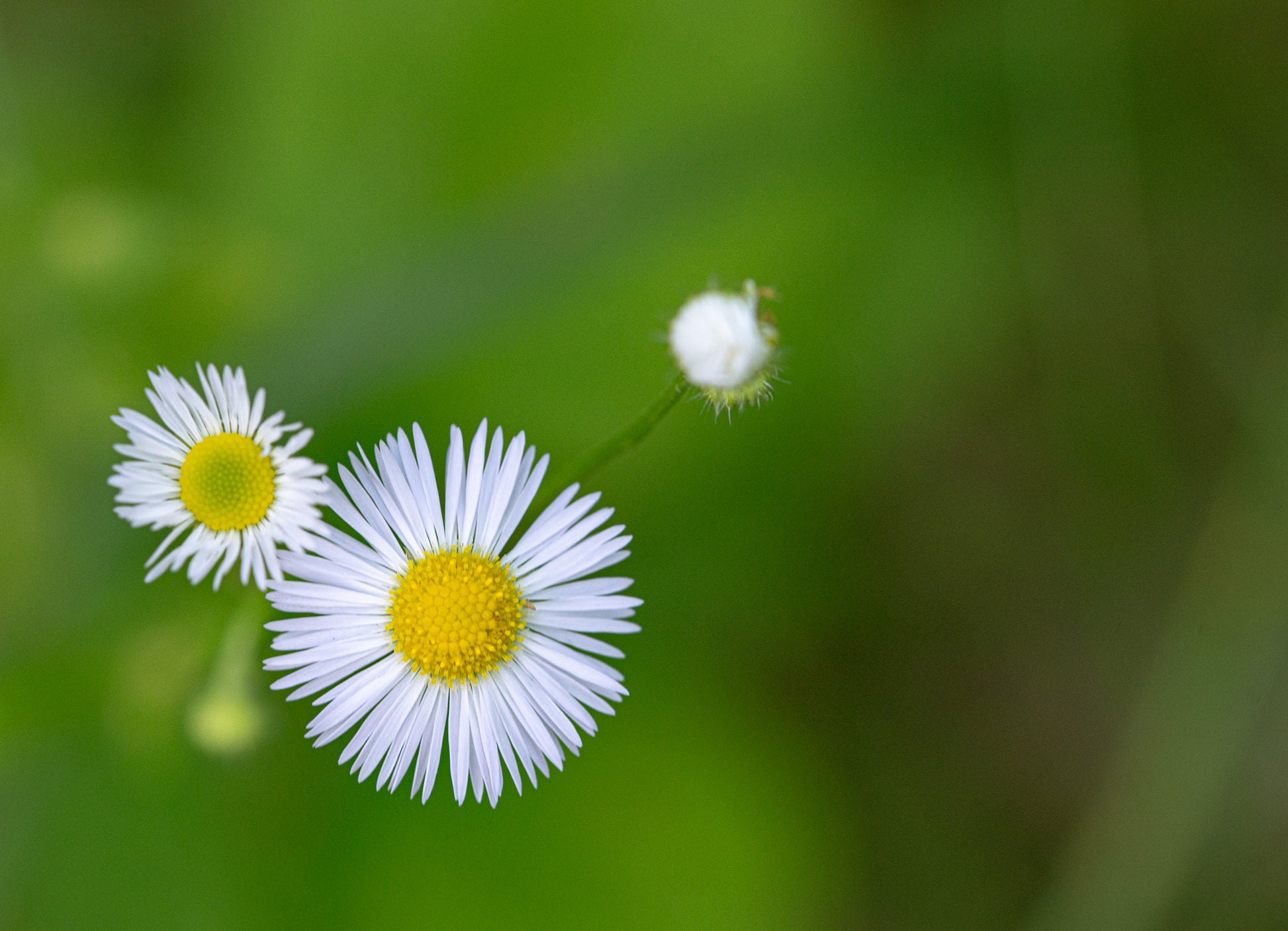 One, two, three. A triad of fleabane floats on a sea of green. Suspended and isolated in color, these tiny daisies enchanted my lens and captured my heart. The utter simplicity spoke to me. What do you hear? Glen Arbor, Michigan